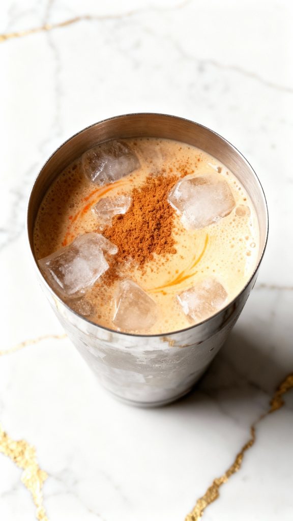 Add ¼ tsp pumpkin pie spice to the shaker with the liquids.