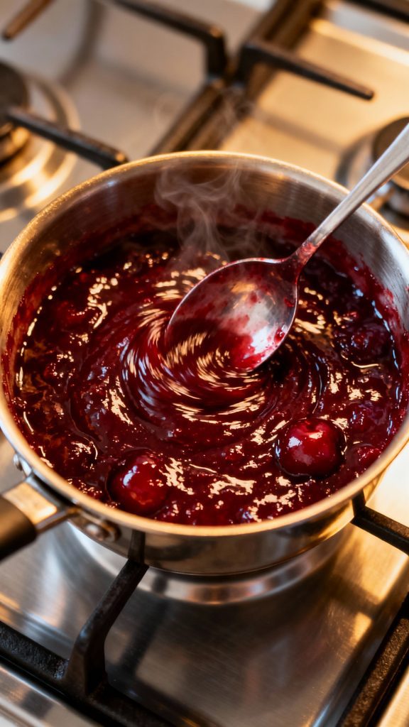 Add 1/2 cup frozen dark sweet cherries and 1 tbsp water to a small saucepan. Cook over medium heat for 5–7 minutes, stirring occasionally, until the cherries are soft and syrupy. Use the back of a spoon to lightly mash a few.
