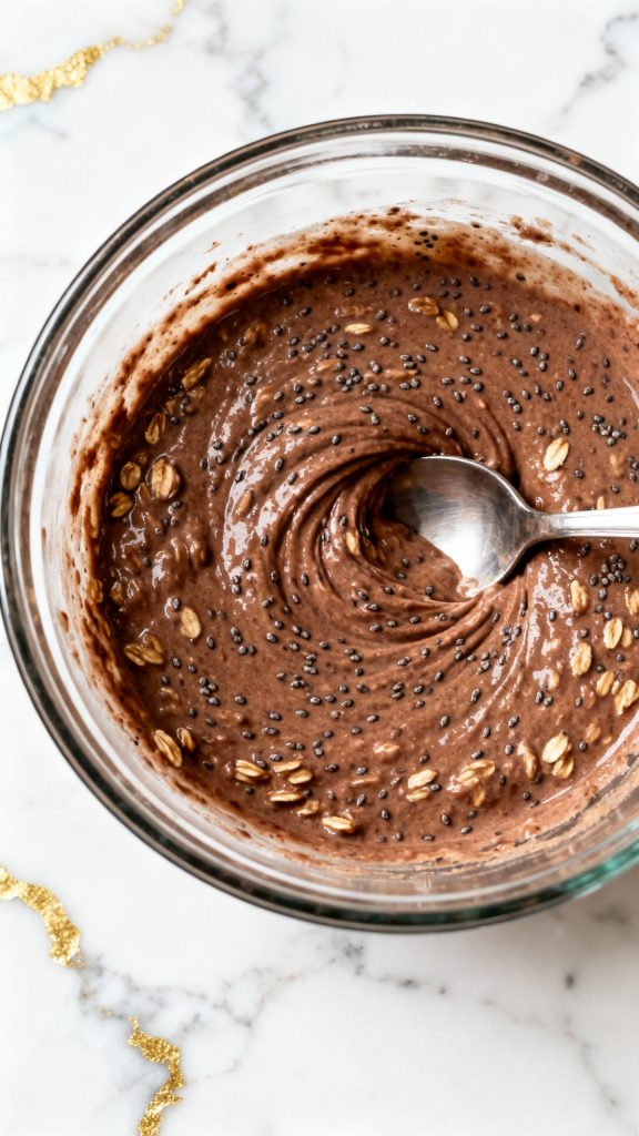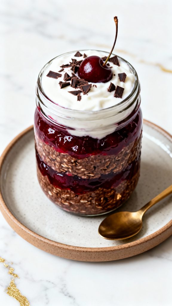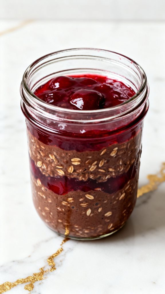 Oats and chia seeds absorb liquid overnight, creating a creamy, pudding-like texture. Cocoa adds rich chocolate flavor without extra sugar, and cherries naturally complement chocolate with their tart-sweet balance. Greek yogurt adds creaminess and protein, while a bit of chocolate on top gives that dessert vibe.