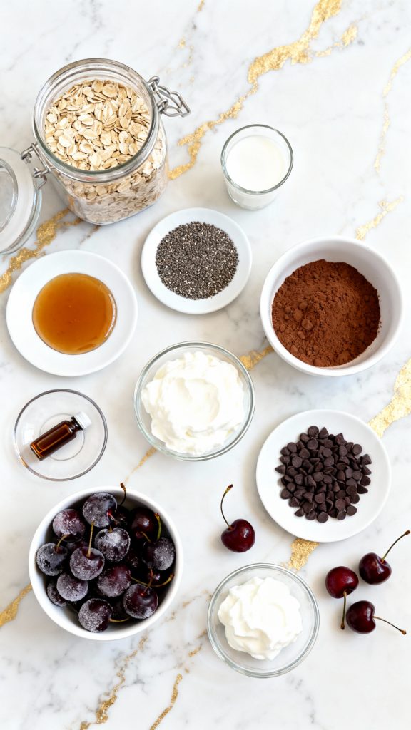 Top-down shot of all ingredients spread out neatly on white marble counters with hints of gold. Display includes a small clear bowl of rolled oats, a teaspoon of chia seeds, a tablespoon of cocoa powder, a small glass of milk, a spoon of maple syrup, a tiny glass bowl of plain Greek yogurt, a measuring spoon with vanilla extract, a small white bowl of frozen dark sweet cherries, a spoonful of dark chocolate chips, and a few extra cherries and yogurt in separate small bowls. A straight 90-degree top-down shot with no tilt, captured directly overhead.