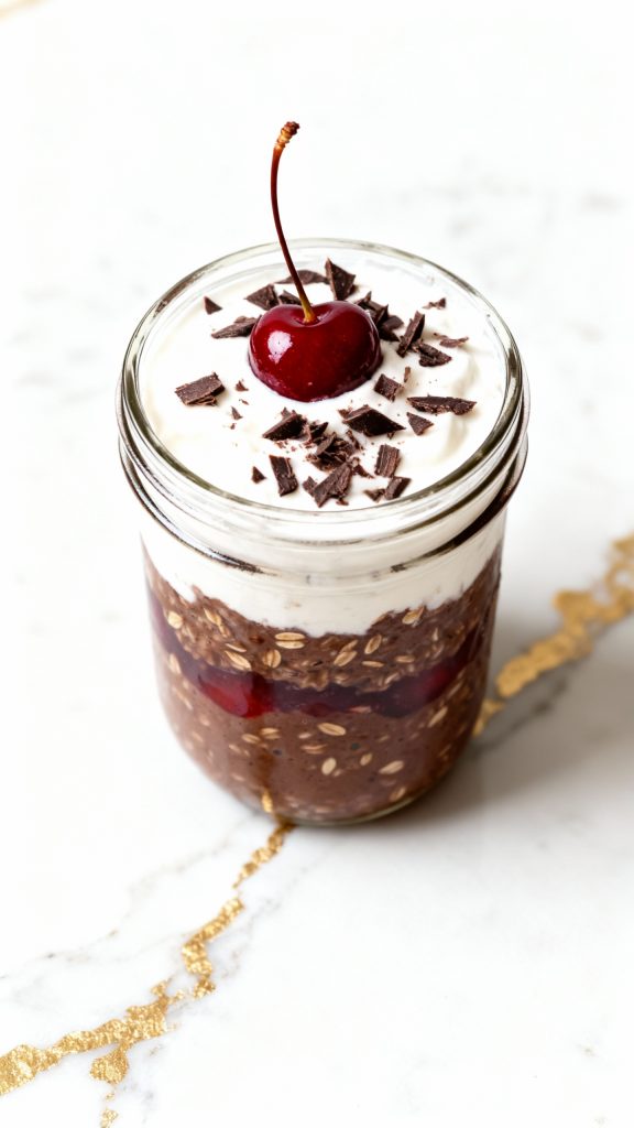 Top the jar with 1/4 cup plain Greek yogurt, then sprinkle with 1 tbsp dark chocolate chips or shaved chocolate. Add a cherry or two if you’re feeling fancy.