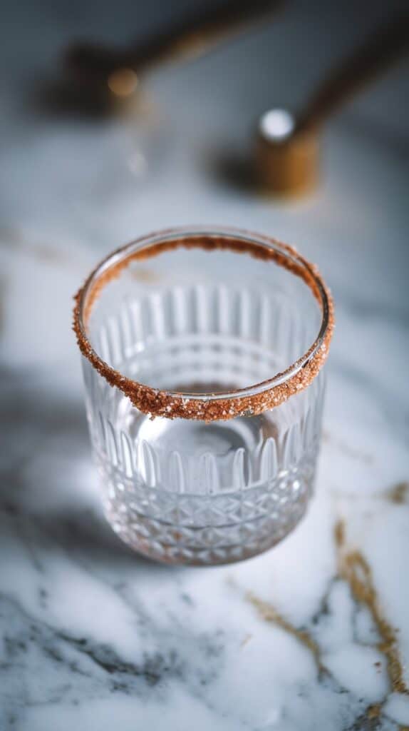 Rub the lime wedge around the rim of the glass. Dip the rim into the cinnamon sugar until evenly coated.