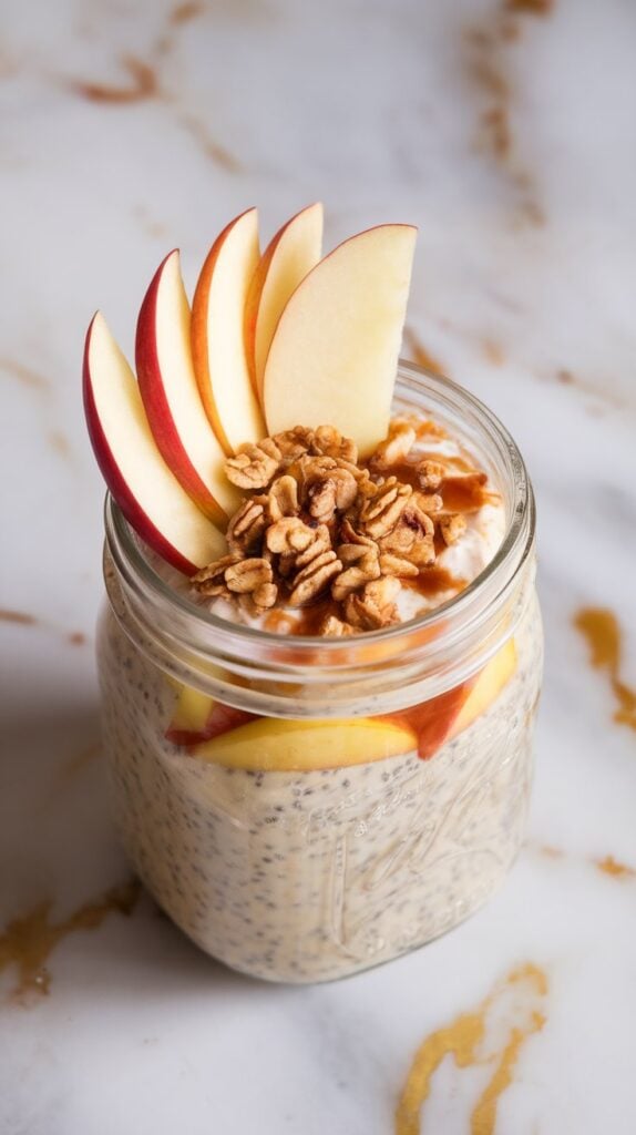 The next morning, open the jar and top with extra apples, maple syrup, or granola if you like. Eat cold and enjoy!