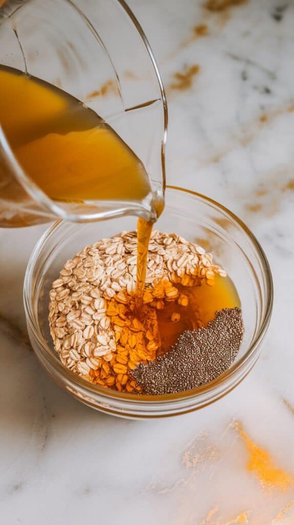 Pour in 1 cup apple cider over the oats and chia. Let it soak in for a second.