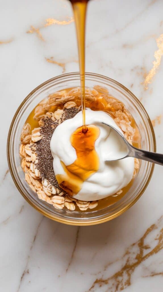 Add ½ cup plain Greek yogurt and 1 tablespoon maple syrup to the bowl.