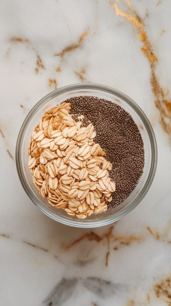 Add 1 cup old-fashioned rolled oats and 1 tablespoon chia seeds to a small mixing bowl.