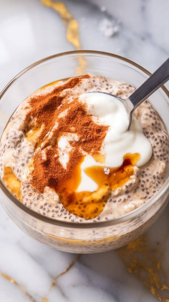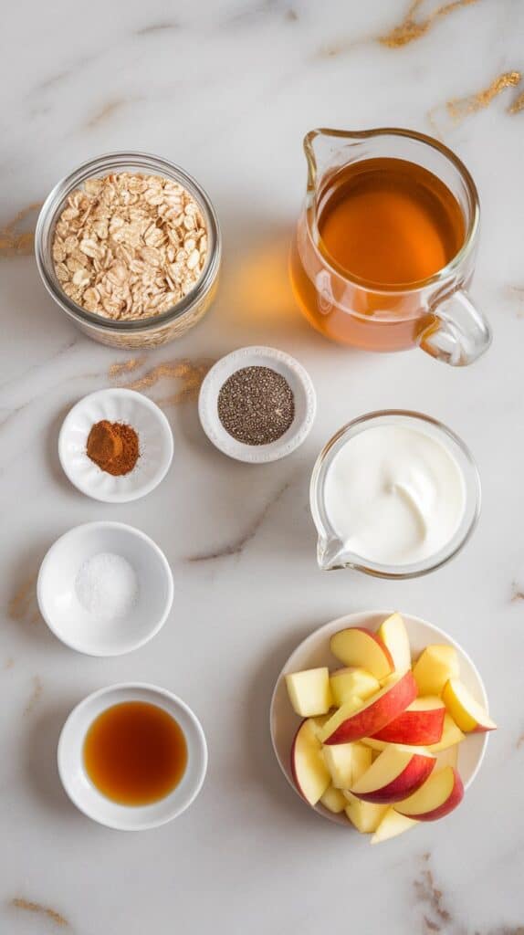Chia seeds soak up the liquid and thicken the oats overnight, creating that creamy, pudding-like texture. The yogurt adds protein and a tangy balance to the sweet apple cider, and the oats slowly absorb all those warm fall flavors while they chill.