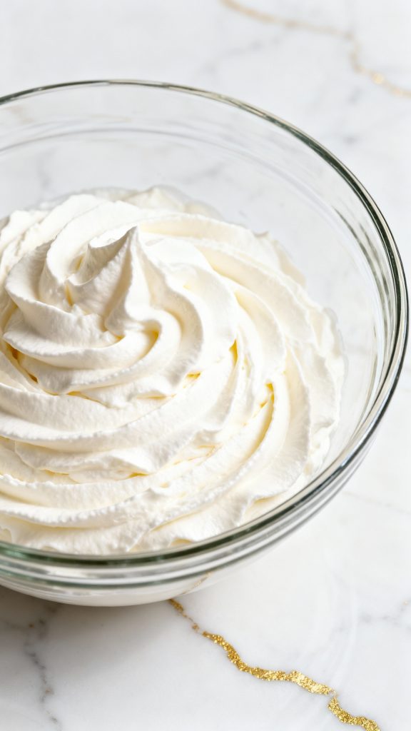 In a chilled bowl, whip the heavy cream until stiff peaks form.