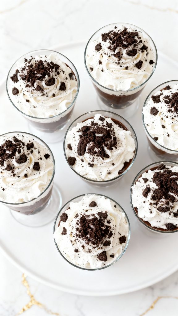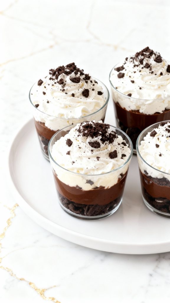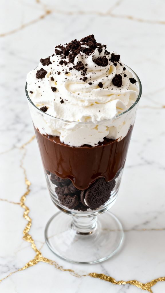 Start layering in a clear glass: begin with crushed Oreos, then pudding, then whipped cream. Repeat the layers once more. Top with crushed Oreos or chocolate shavings if you like.