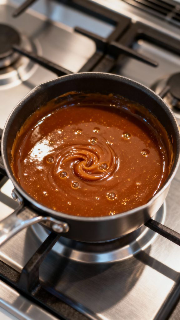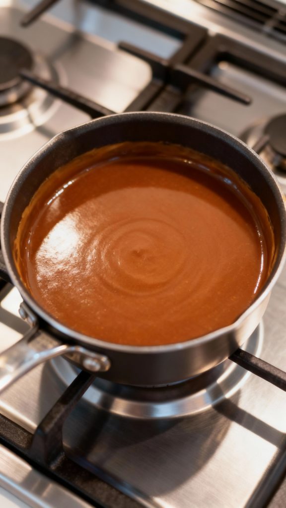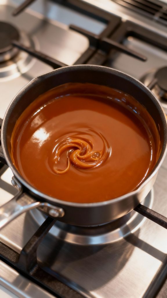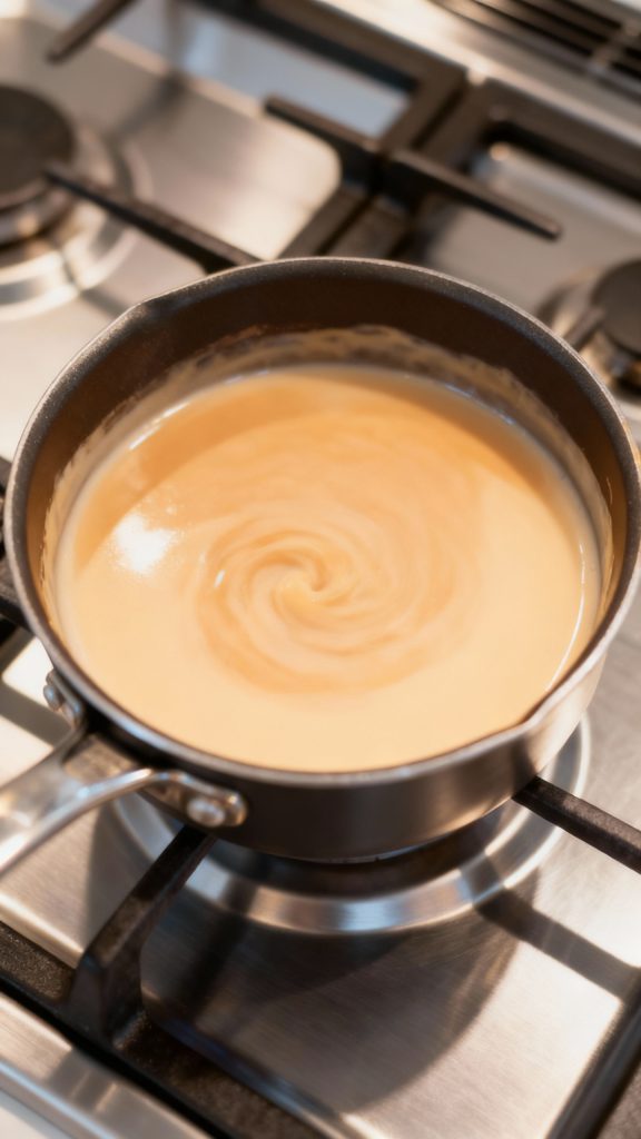 Slowly pour in 2 cups whole milk, whisking constantly to blend with the caramel base. Keep whisking over medium heat until it thickens, about 5–7 minutes.