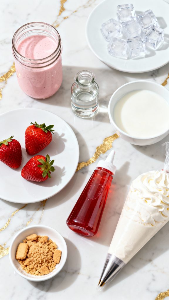 Top with whipped cream, crushed shortbread cookie, and a fresh strawberry. Drizzle with a little strawberry syrup if desired.