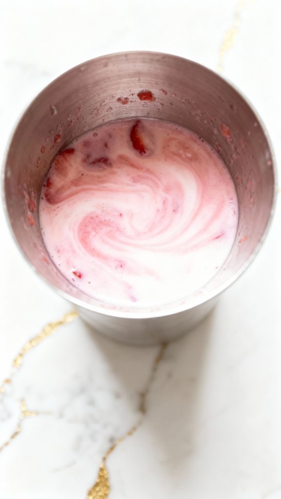 Pour 2 oz Baileys Strawberries & Cream, 1 oz vanilla vodka, and 2 oz cold whole milk into the shaker over the muddled strawberries.