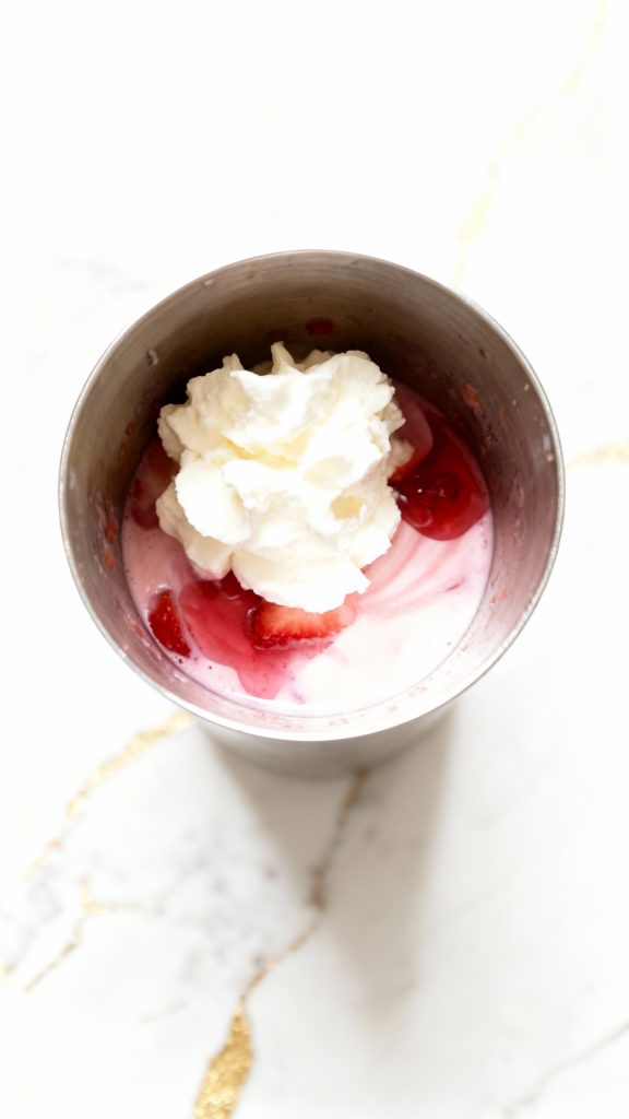 Add 1 tbsp strawberry syrup and 2 tbsp whipped cream to the shaker.