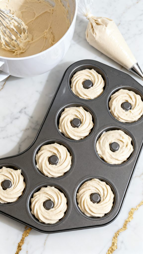 Lightly grease a donut pan. Spoon or pipe the batter evenly into each cavity, filling about ¾ full.