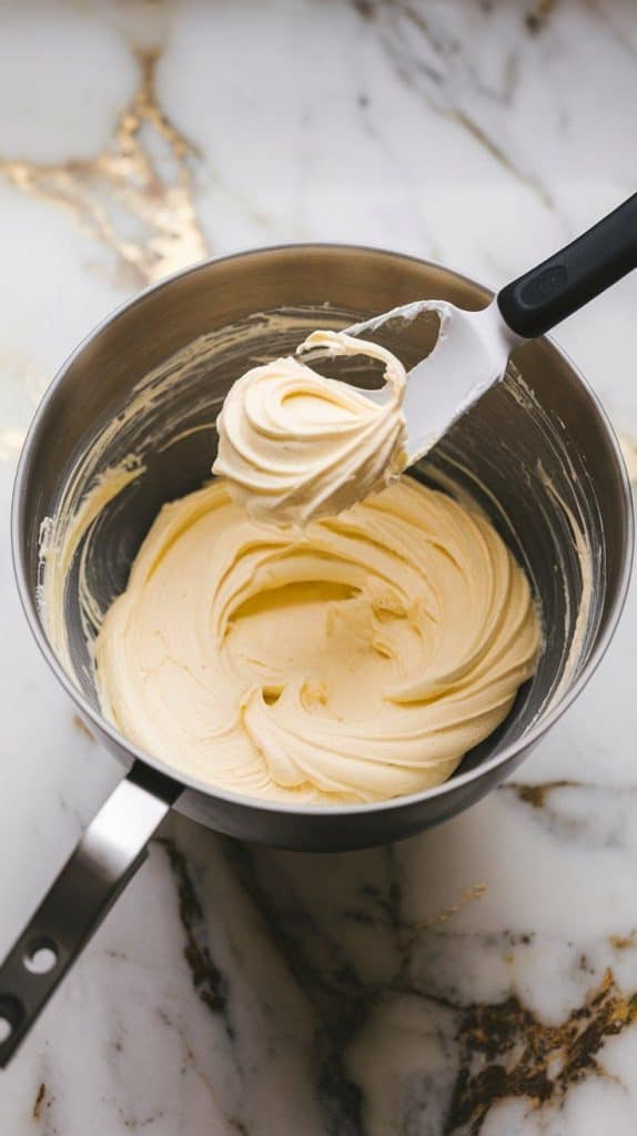 Beat the cream cheese, butter, powdered sugar, and vanilla extract until smooth and creamy.