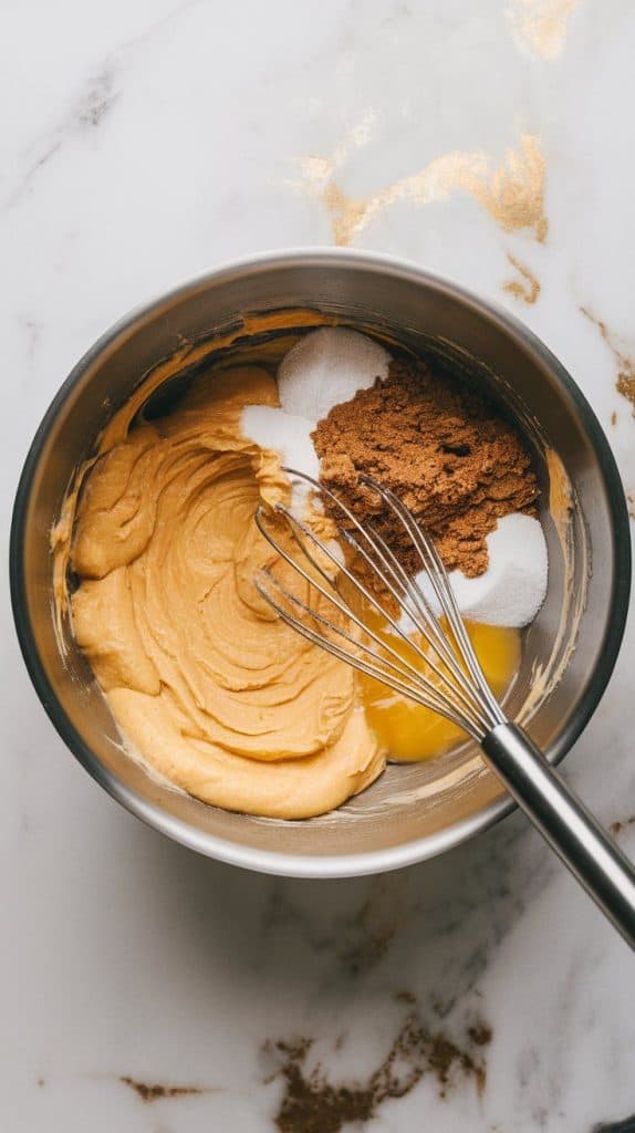 Stir in the melted butter, brown sugar, granulated sugar, eggs, and vanilla extract. Mix until smooth.