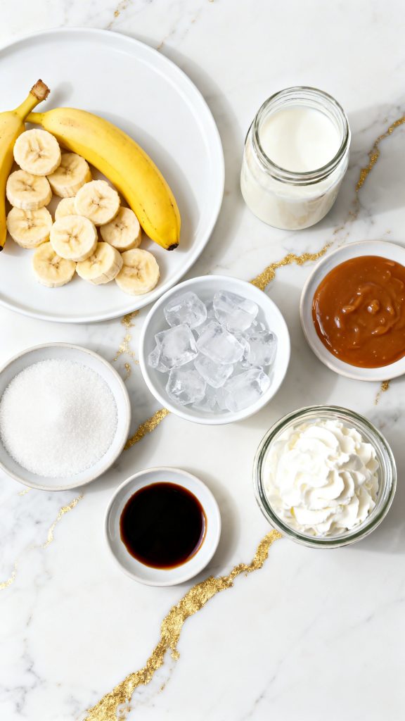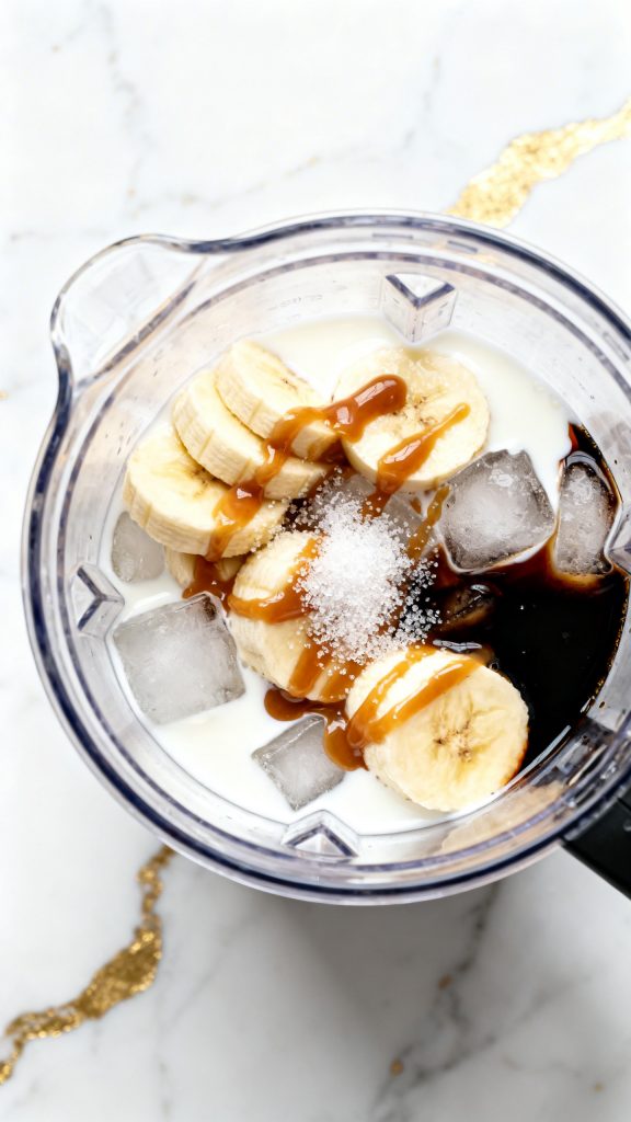 Bananas act as a natural thickener because of their fiber and starch. When blended, they create a creamy texture without needing ice cream. Ice chills and thickens, while caramel adds both sugar and a smooth syrupy texture that blends evenly.