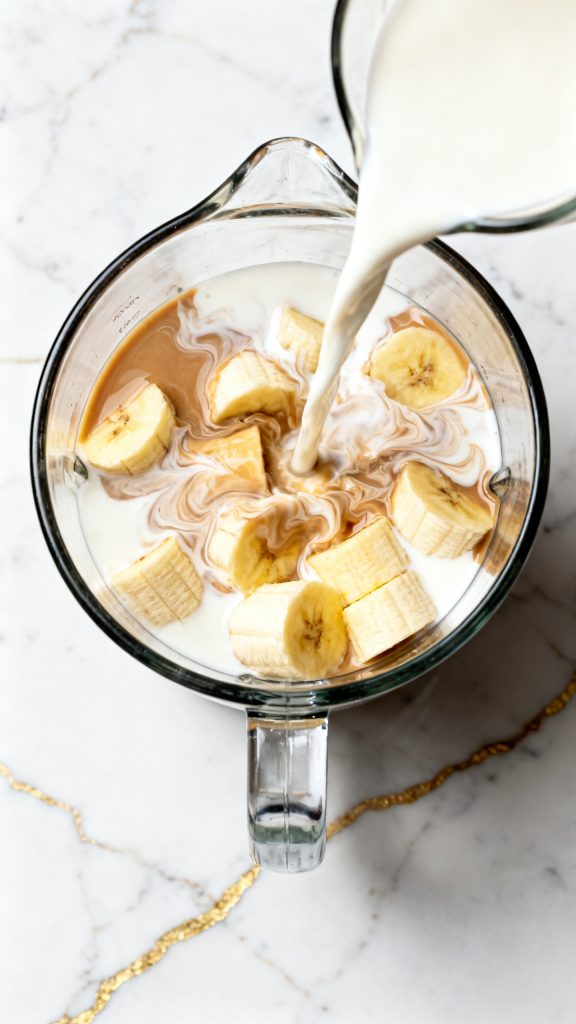 Add ¾ cup chilled brewed coffee and ½ cup unsweetened almond milk into the blender over the banana.