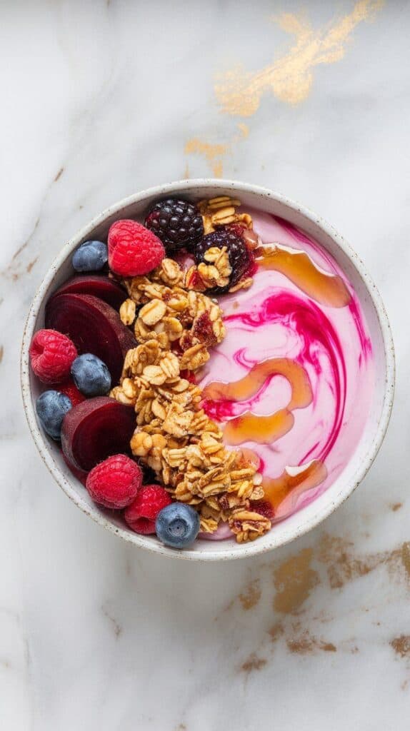 This combo is wild, but it just works. The first time I tried beets in a yogurt bowl, I wasn’t sure what to expect. But they blend in beautifully—adding color, creaminess, and a slightly earthy vibe that’s balanced perfectly by the berries and honey. It’s one of those “wait, what is this?!” bowls that makes you take another bite just to be sure.