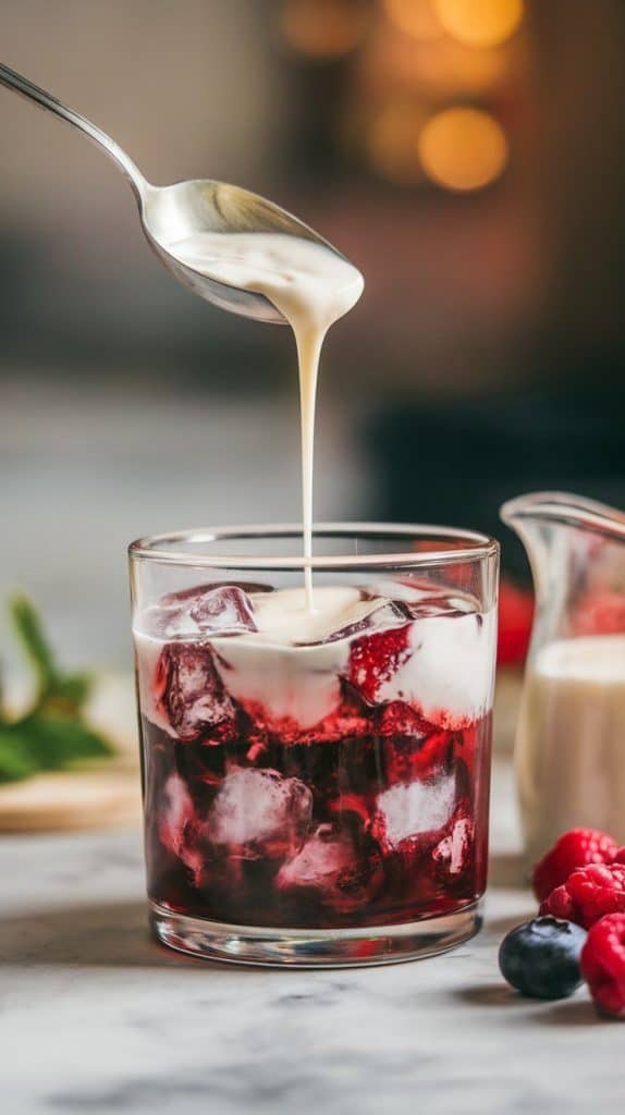 Slowly pour the heavy cream over the back of a spoon into your glass, creating those dreamy swirls.