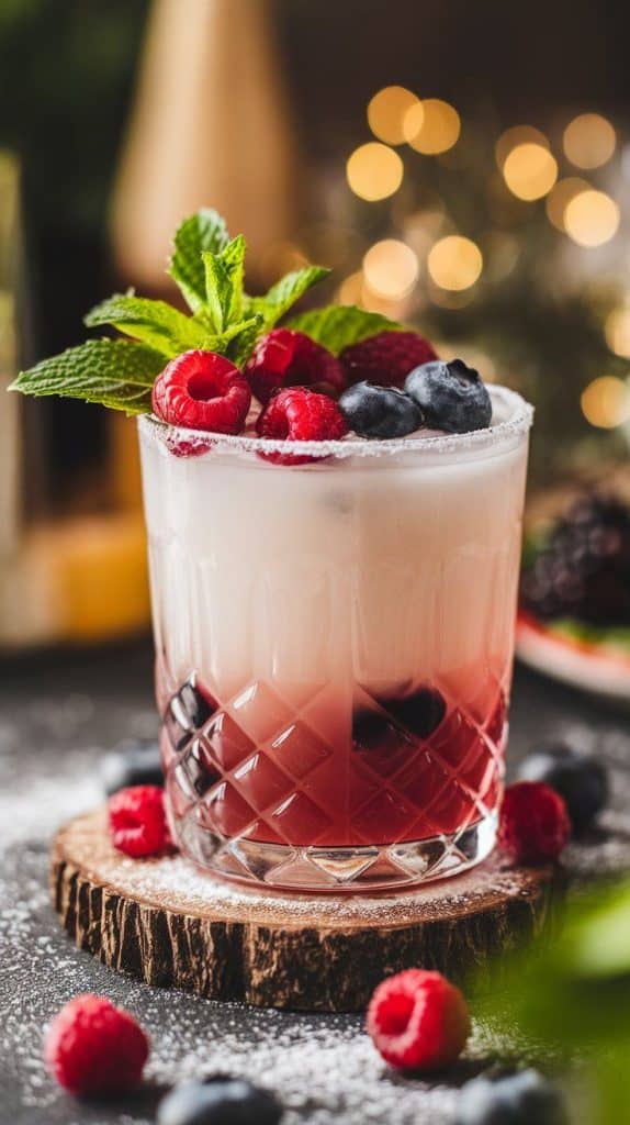 A super close-up shot of a Berry White Russian topped with fresh raspberries, blueberries, a sprinkle of powdered sugar, and a bright mint sprig