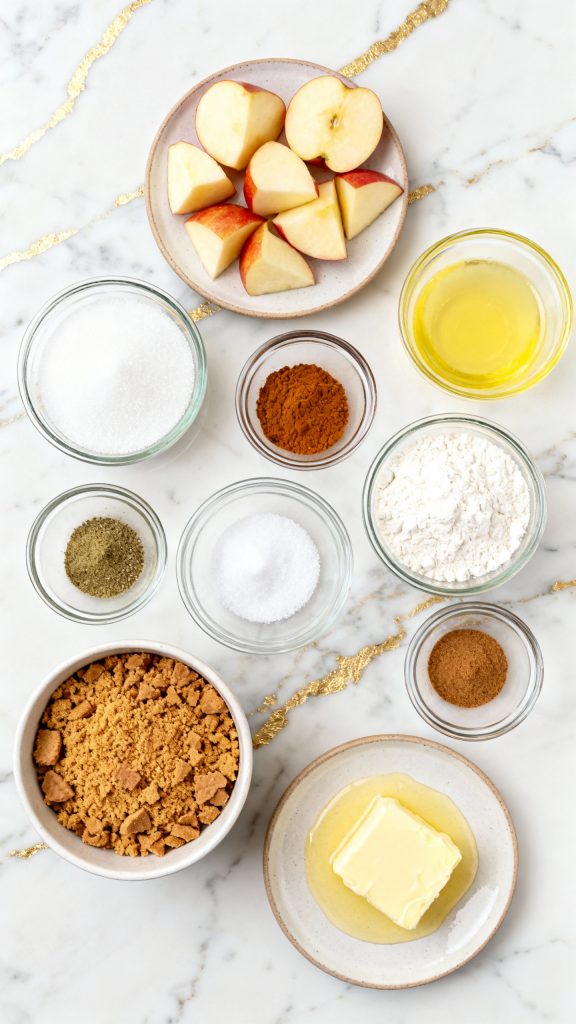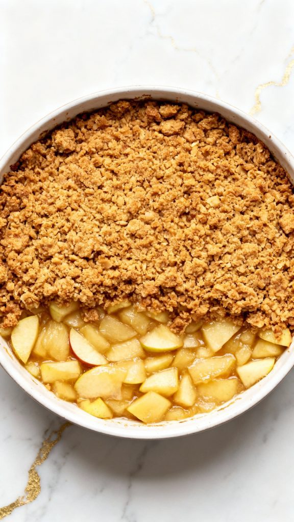 Spread the apple mixture into a greased 8×8 baking dish. Sprinkle the crumble topping evenly over the apples.