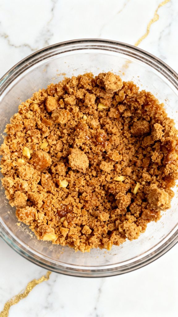 In a separate bowl, combine 1 cup crushed Biscoff cookies, 1/2 cup all-purpose flour, 1/3 cup brown sugar, 1/2 teaspoon cinnamon, and 1/2 cup melted unsalted butter. Stir until crumbly.