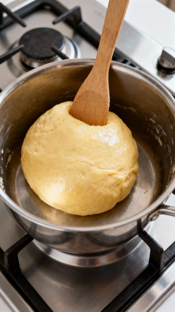 - Boiling water and butter cooks the flour, gelatinizing starch so the dough can puff when fried.