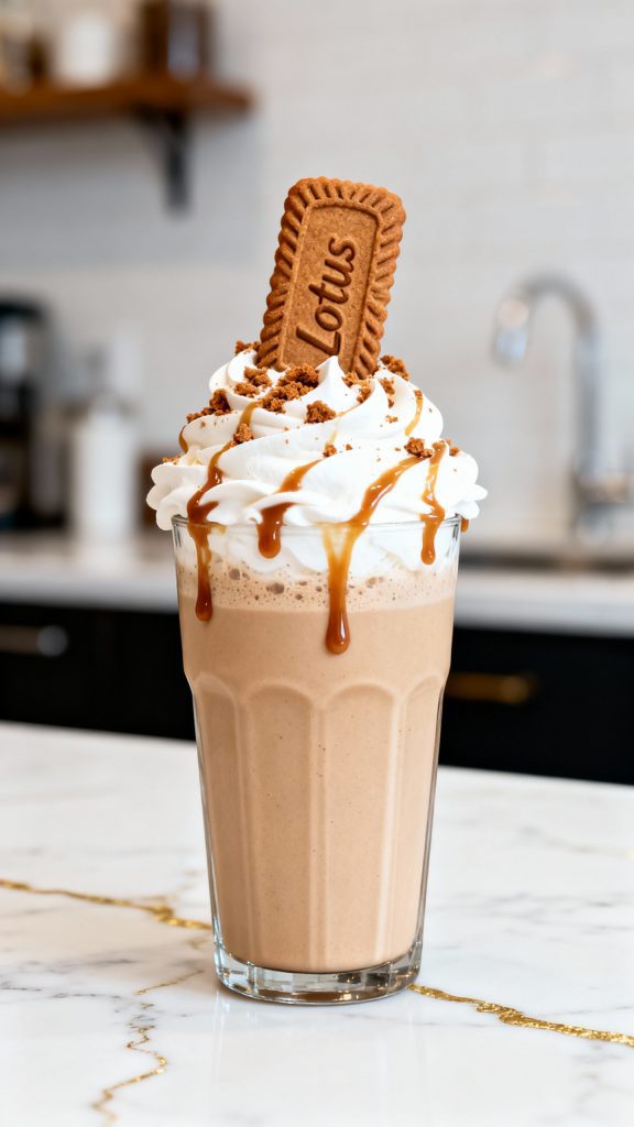 Pour into two tall glasses. Top with whipped cream, a drizzle of melted Biscoff spread, and extra crushed cookies. Stick a whole Biscoff cookie on top for a fun look.