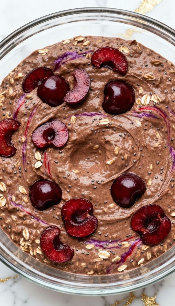 Chocolatey oats, sweet cherries, and a creamy layer on top—no baking needed.