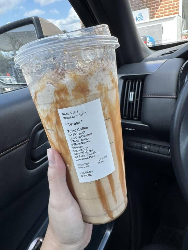 - Top with caramel drizzle, extra pecan crunch, and a sprinkle of cinnamon powder.