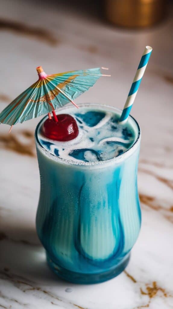 This drink takes me back to sitting at a pool bar in the Caribbean. The color alone is enough to make you smile, but the taste is even better. It’s tropical, creamy, and just a little citrusy from the blue curaçao.