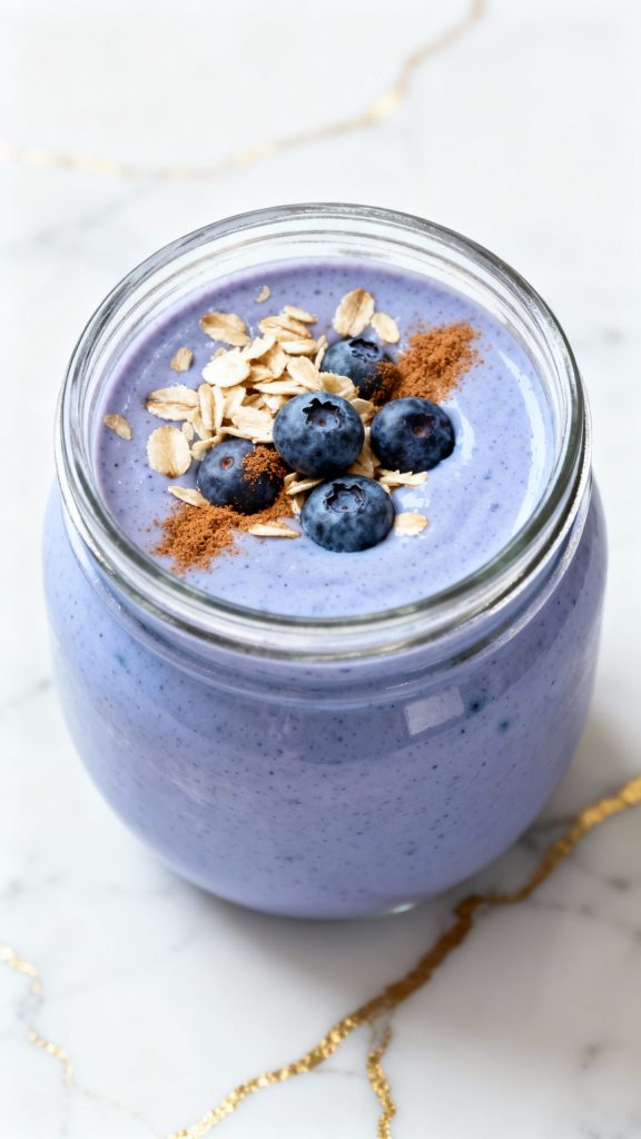 Pour the shake into a glass jar or cup. Top with a sprinkle of oats, a pinch of cinnamon, and a few extra blueberries if you want.