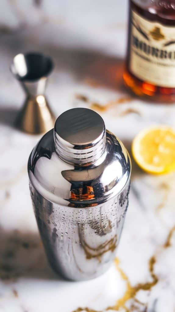 Instructions: Pour 2 oz of bourbon, 1 oz of limoncello, and 1/2 oz of fresh lemon juice into the shaker over the ice.