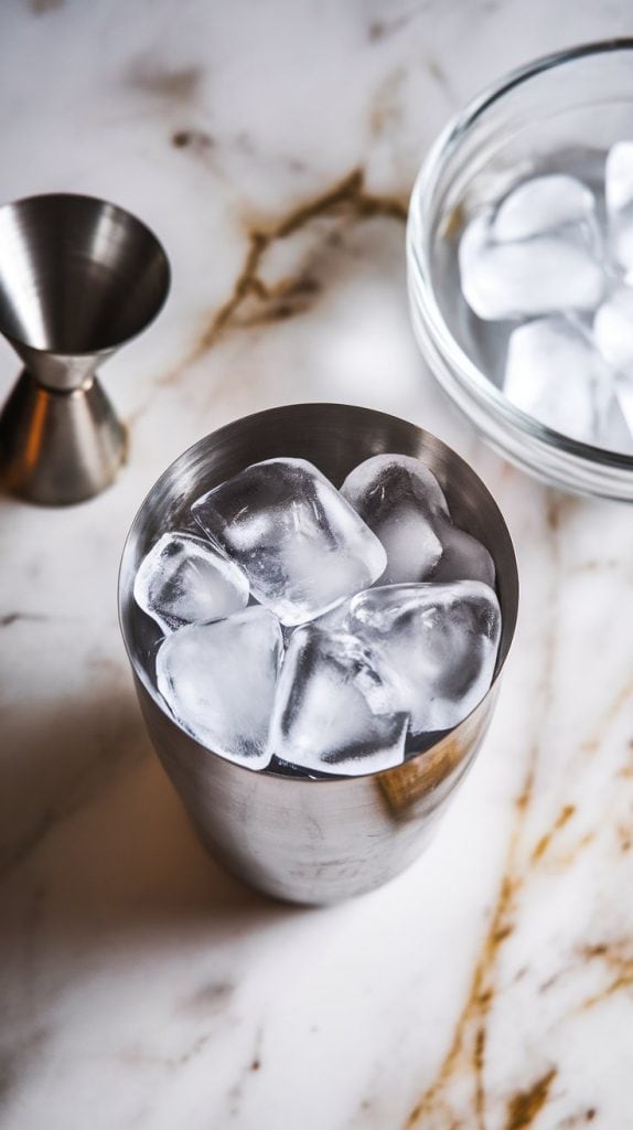 Instructions: Fill your cocktail shaker about halfway with ice cubes.