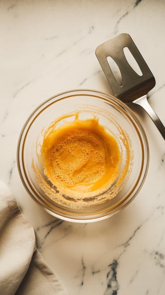 In a separate bowl, whisk the cooled brown butter with 1 cup packed dark brown sugar and ¼ cup granulated sugar until smooth. Then whisk in 1 large egg, 1 egg yolk, 2 tbsp pure maple syrup, and 1 ½ tsp vanilla extract until creamy and well blended.