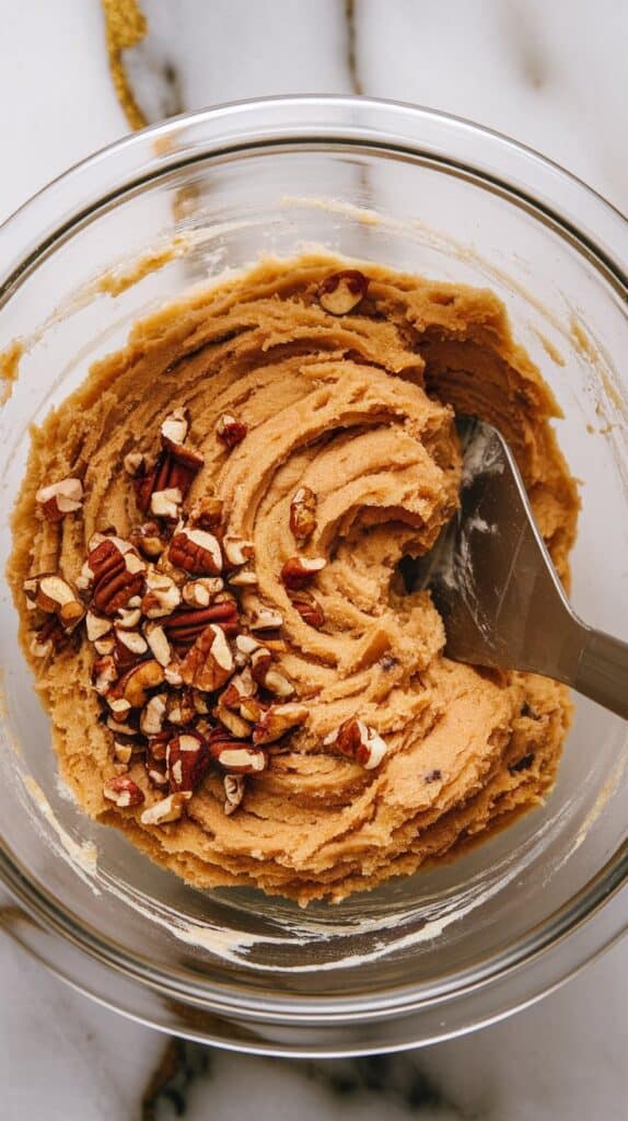 Fold in 1 cup chopped pecans until evenly distributed in the dough.