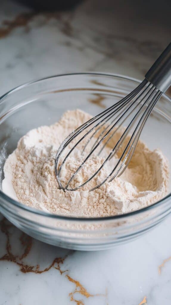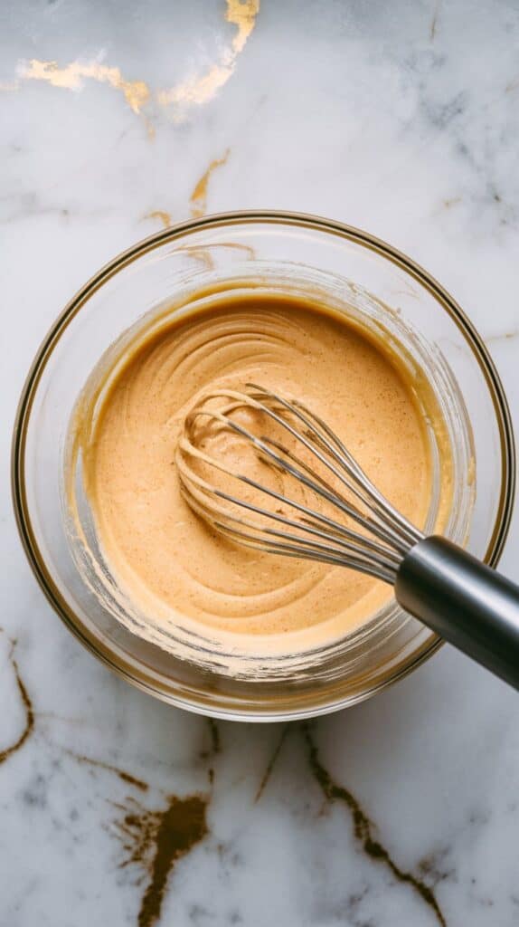 Pour the wet mixture into the flour mixture. Use a rubber spatula to fold everything together gently until no dry streaks remain — don’t overmix.