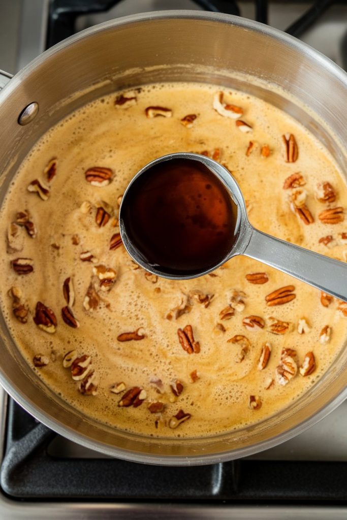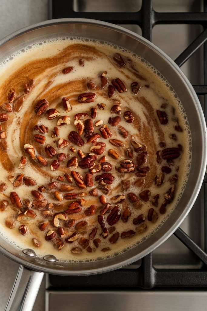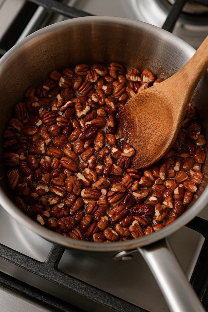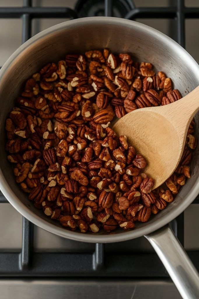 Add 1 tbsp unsalted butter to the toasted pecans in the same pan. Let it melt and cook for 2–3 minutes until it smells nutty and has golden brown flecks. Stir constantly.