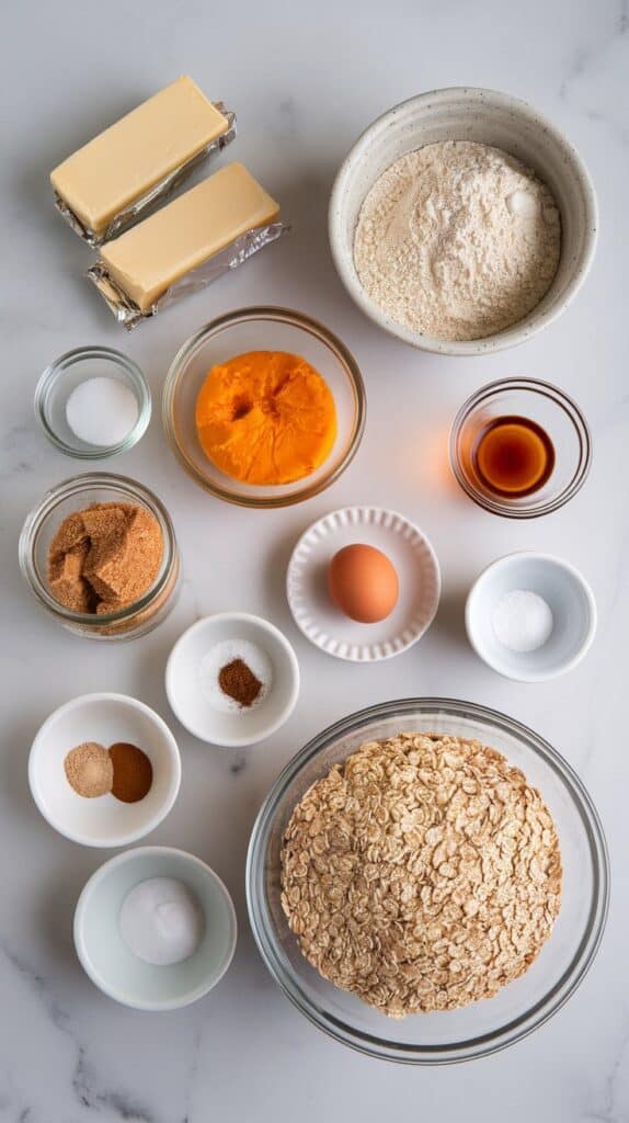Browning the butter cooks out water and toasts the milk solids, which brings a nutty, almost caramel-like depth. Pumpkin adds moisture and natural sweetness, but because it’s not very sticky on its own, the oats and brown sugar work together to hold everything together. The baking soda reacts with the acid in the brown sugar and pumpkin, making the cookies rise just enough while keeping them chewy.