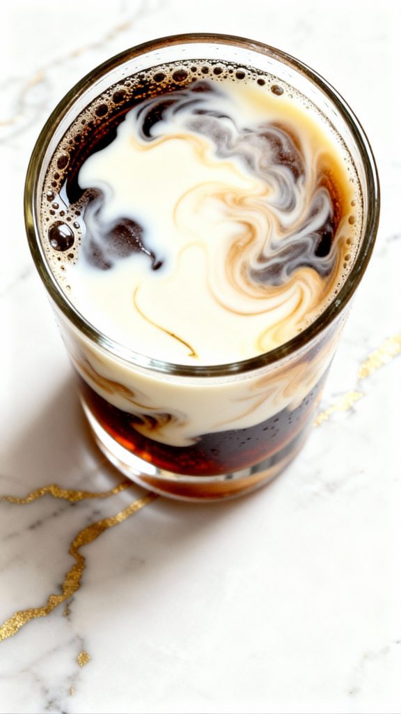 In a small bowl, mix ¼ cup half & half with ¼ tsp vanilla extract. Pour it slowly into the glass for a swirling effect.