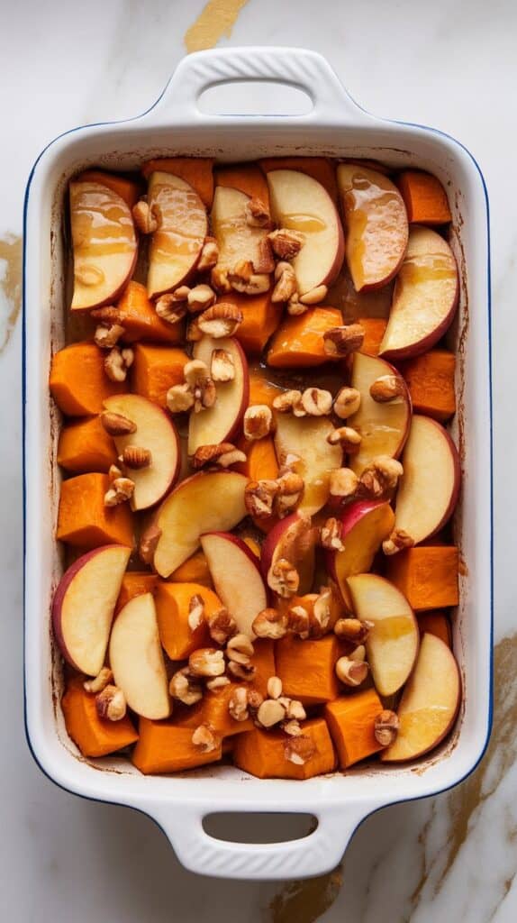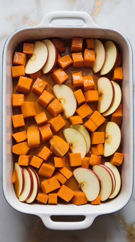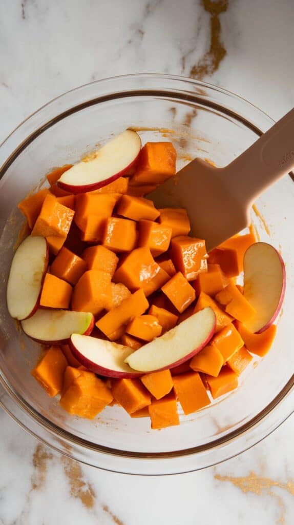 Add the cubed squash and sliced apples into the bowl with the glaze. Toss everything until well coated.