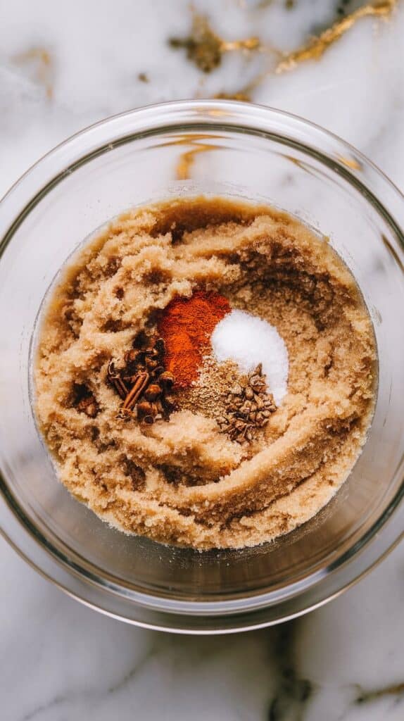 In a medium bowl, combine ¾ cup packed light brown sugar, ½ teaspoon cinnamon, ¼ teaspoon nutmeg, ¼ teaspoon ginger, ⅛ teaspoon cloves, and ½ teaspoon salt. Stir together.