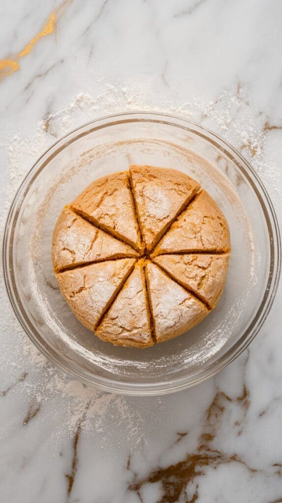 Transfer the dough onto a floured surface. Gently pat into a 1-inch thick round disk. Cut into 8 even wedges using a knife or bench scraper.