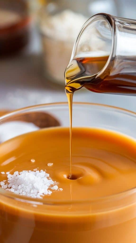A super close-up shot of a drop of vanilla extract being poured into the melted butterscotch mixture