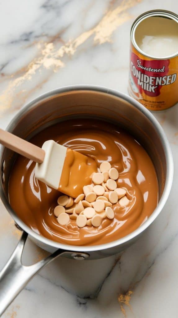 In a saucepan over low heat, melt butterscotch chips, white chocolate chips, and sweetened condensed milk, stirring constantly until smooth.