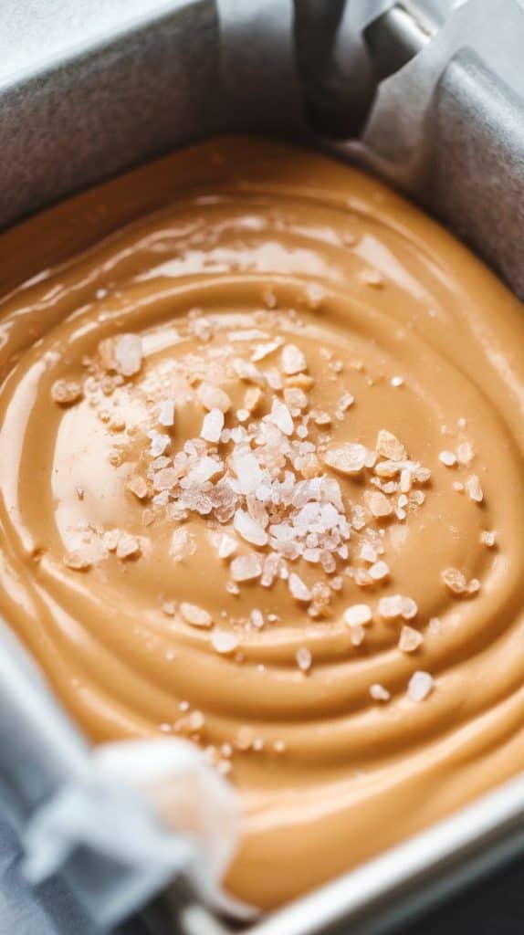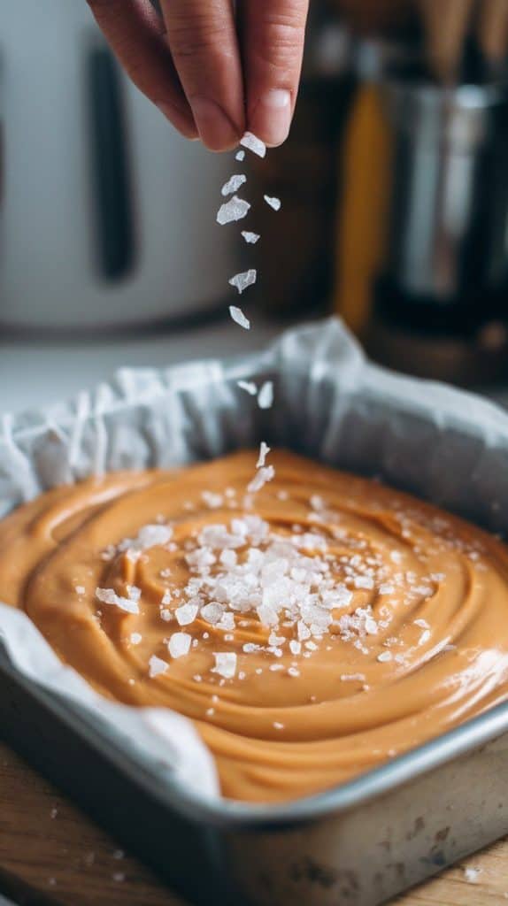 A super close-up shot of flaky sea salt being sprinkled over glossy butterscotch fudge
