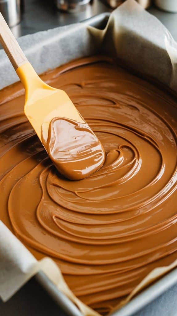 A super close-up shot of a spatula spreading smooth butterscotch fudge into a parchment-lined baking dish
