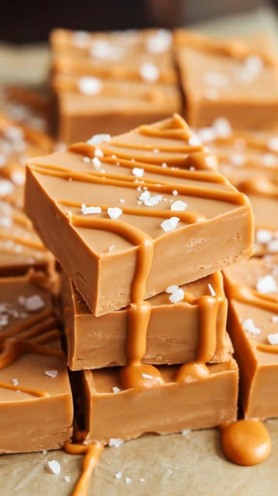 A super close-up shot of Butterscotch Fudge squares stacked on parchment paper, drizzled with melted butterscotch and sprinkled with sea salt.