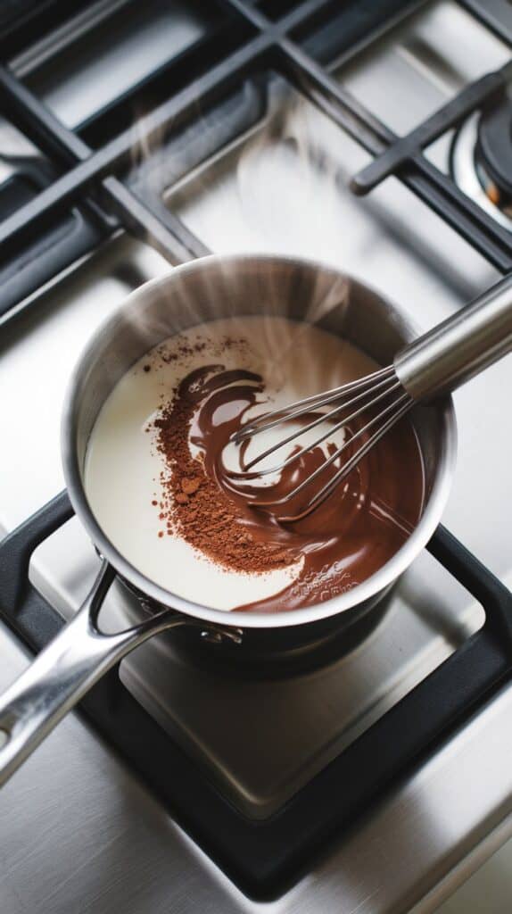 Whisk in 1/2 cup semi-sweet chocolate chips, 2 tbsp unsweetened cocoa powder, and 2 tbsp granulated sugar. Keep stirring until the chocolate melts completely and the mixture is smooth and thickened, about 2–3 minutes.